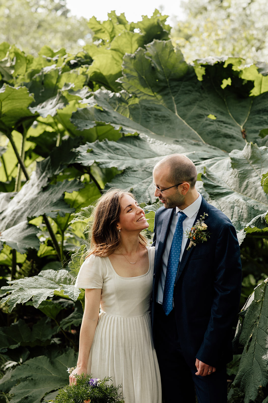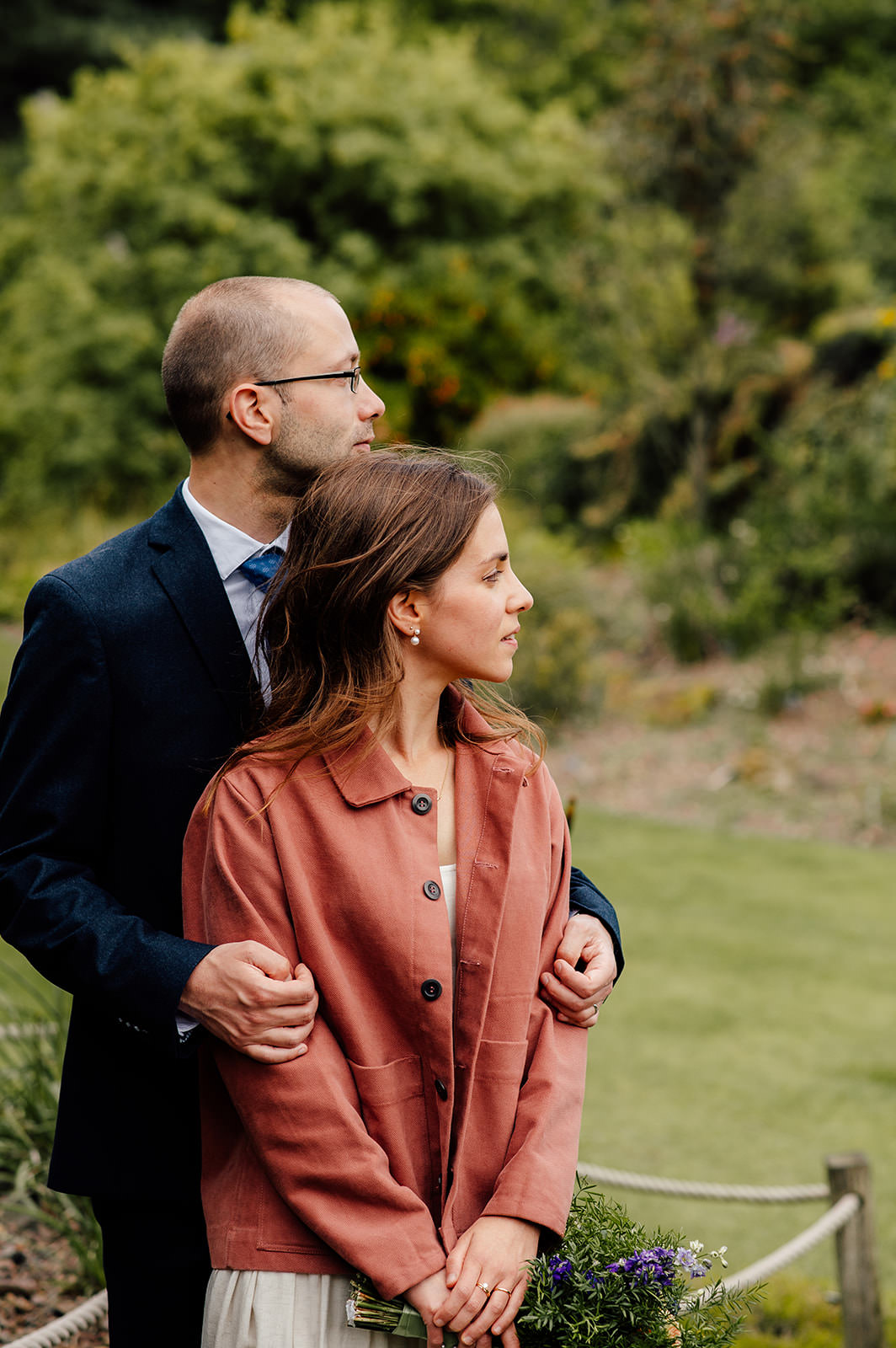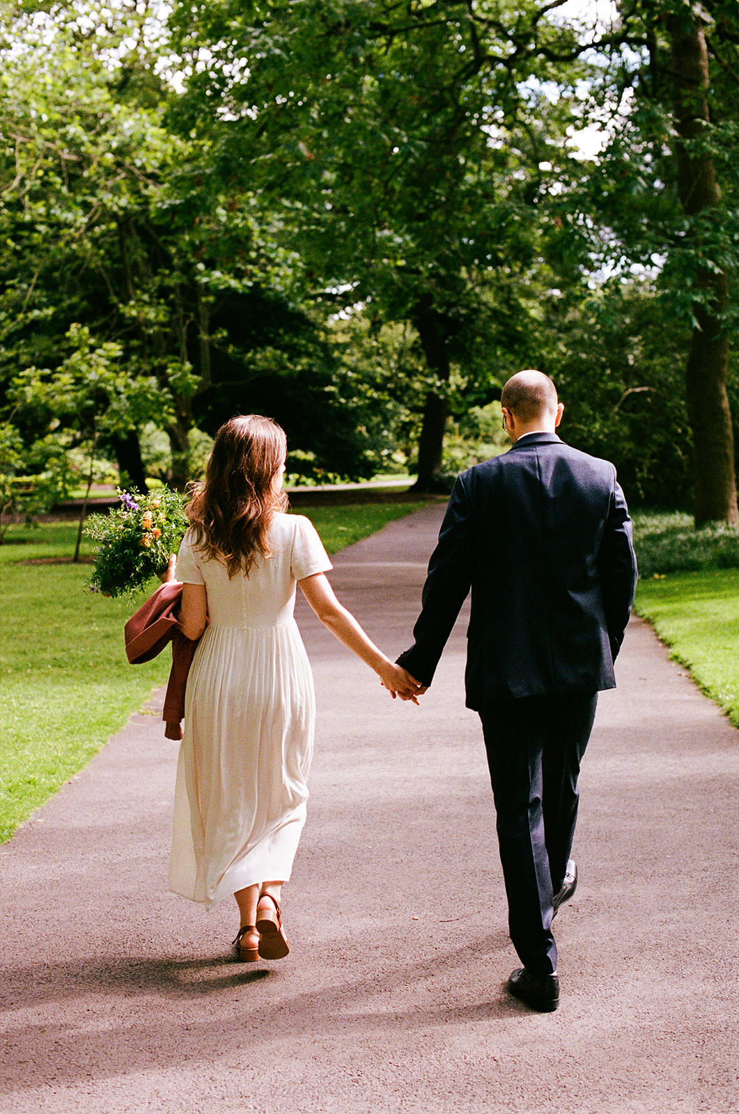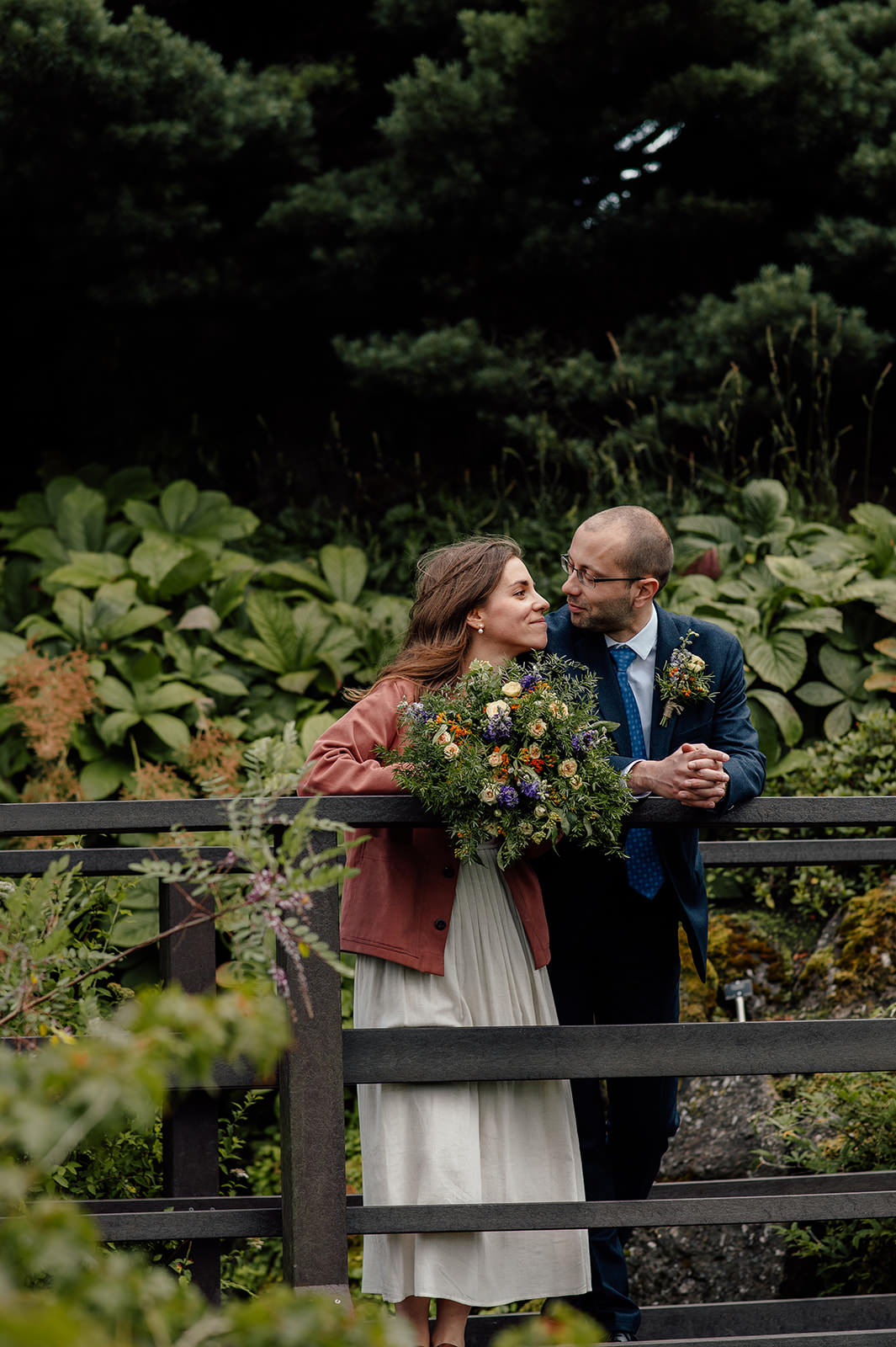 I’ve photographed many Autumn weddings at the Gardens before – I really love John Muir Grove for outdoor ceremonies! That day we had extremely strong winds so the ceremony was moved indoors to a little marquee next to the Caledonian Hall. After the ceremony, the wind has calmed down a bit and everyone gathered for drinks reception outside the Caledonian Hall. The couple have booked a micro package for 3 hours of coverage which was enough to cover the ceremony, drinks reception and a few family photos along the couple photoshoot. We explored the gardens which I really appreciated as we found some wildflowers and more secluded spaces hidden from the public. We took the photos on both digital and 35mm film.